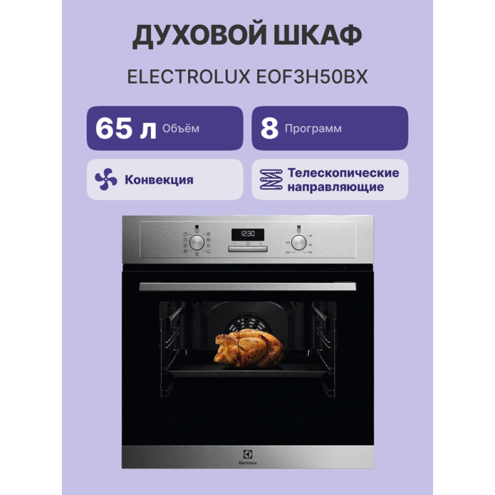 Встраиваемый духовой шкаф ELECTROLUX/ Встраиваемый духовой шкаф ELECTROLUX EOF3H50BX 60 см, 65 л, 8 режимов, 59.4x59.5x56.9 см, очистка паром, нержавеющая сталь,1-уровневые телескопические направляющие.