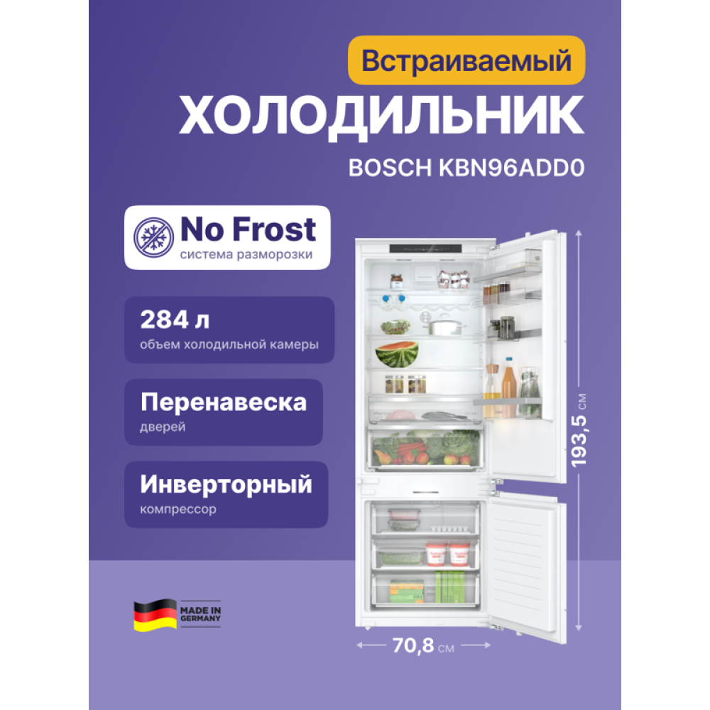 Встраиваемый холодильник BOSCH/ Встраиваемый холодильник BOSCH KBN96ADD0 Serie 6, Встраиваемый холодильник, Home Connect, 1935 x 708 x 548 мм, техника плоских шарниров, SN-ST, Объем 284 (186+98)л, NoFrost в морозильном отделении, LED-освещение, BigBox, F