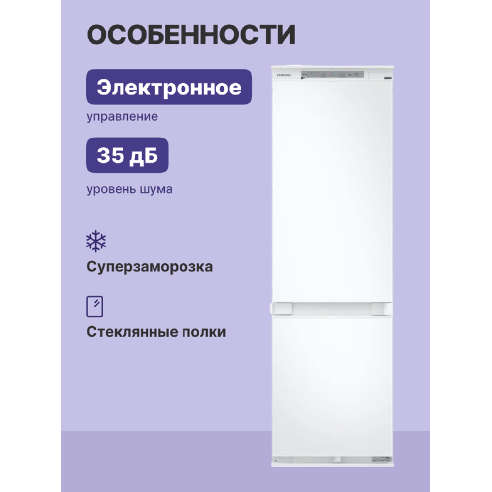 Встраиваемый холодильник Samsung/ 177.5x54x55, Встраиваемый холодильник, All-Around Cooling, 267 л, Full No Frost, инверторный уомпрессор, SpaceMax, Зона свежести, полка Easy Slide, скользящие направляющие