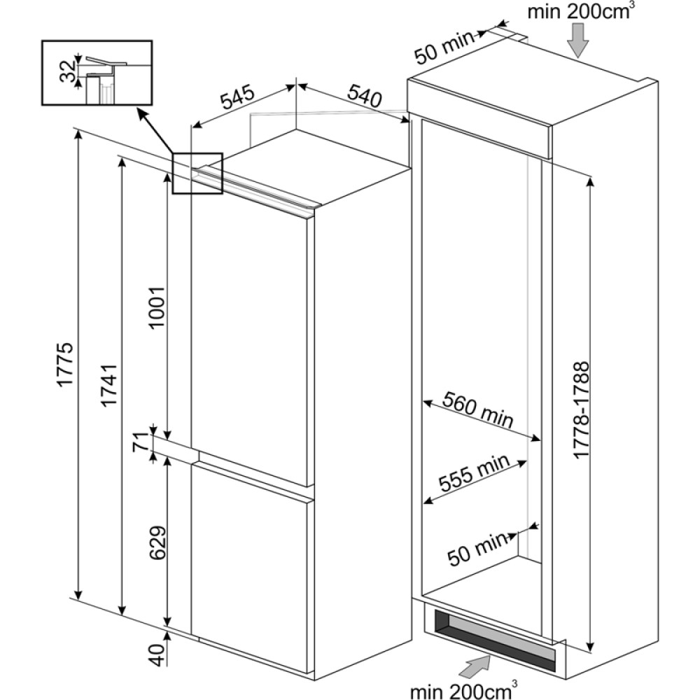 Встраиваемый холодильник SMEG/ Встраиваемый холодильник SMEG, комбинированный, автоматическая разморозка, LED подсветка, инверторный компрессор, механический контроль температуры, полезный объем 193 л, энергоэффективность Е, цвет белый