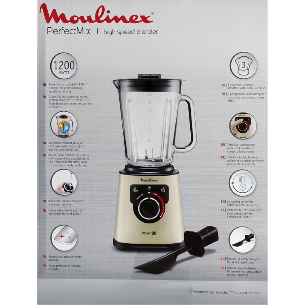 Высокоскоростной блендер Moulinex/ Высокоскоростной блендер Moulinex PerfectMix+, механическое управление, 3 автоматические программы, мощность 1200 Вт, объем чаши 2 л, турбо, съемные лезвия