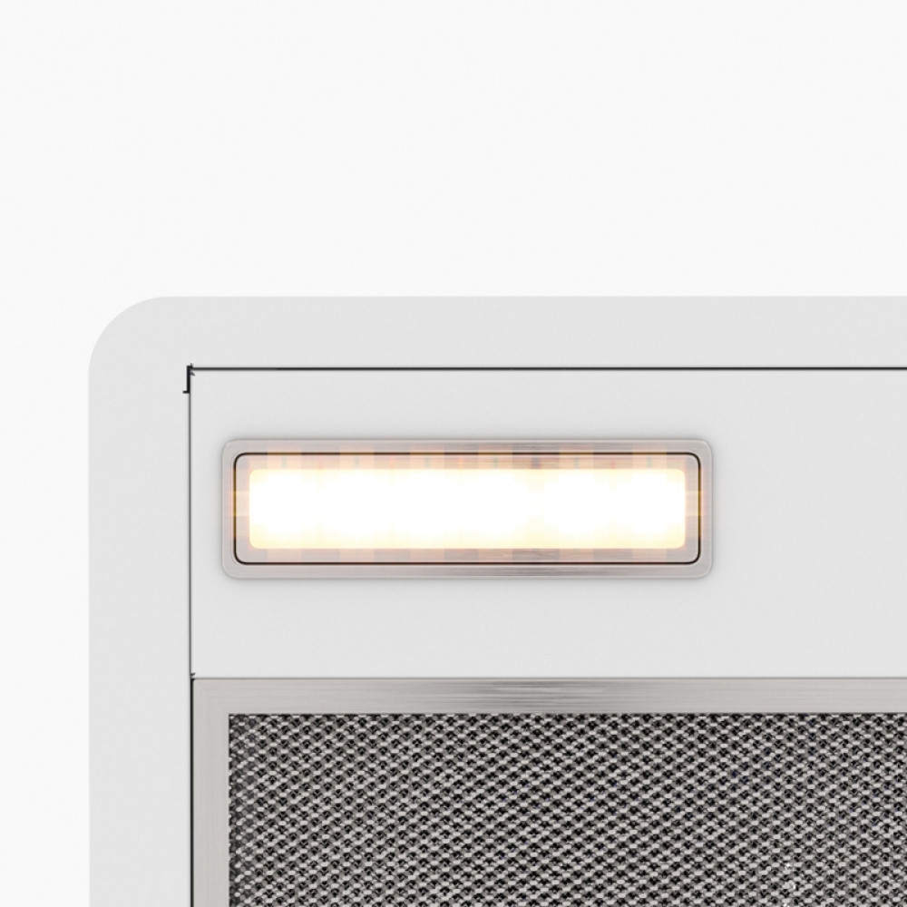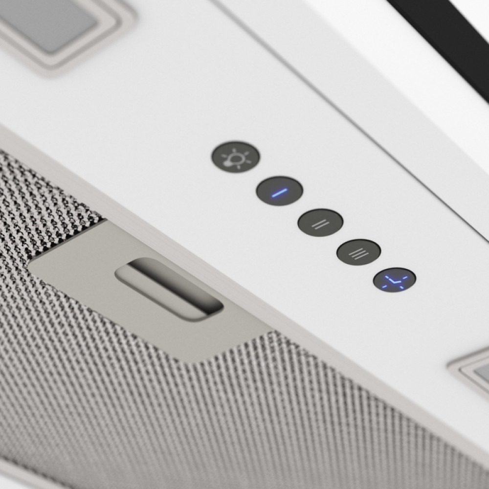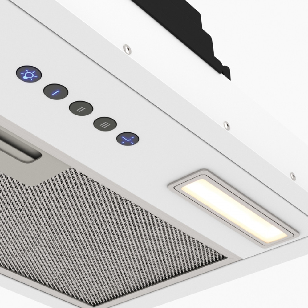 - Современный дизайн: Выполненная в белом цвете, вытяжка добавляет изысканности и стиля кухонному пространству, подчеркивая его современный или минималистичный интерьер.