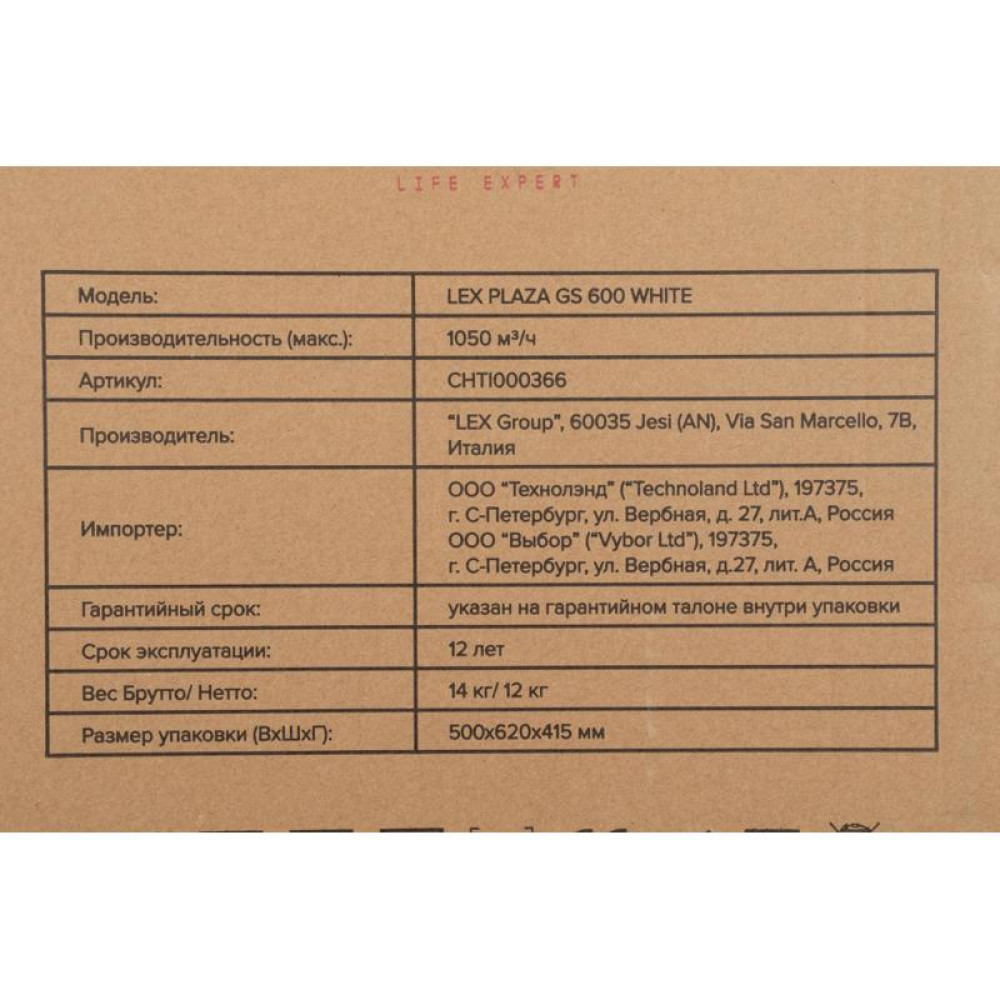 Вытяжка каминная Lex Plaza GS 600 WH белый управление: сенсорное (1 мотор)