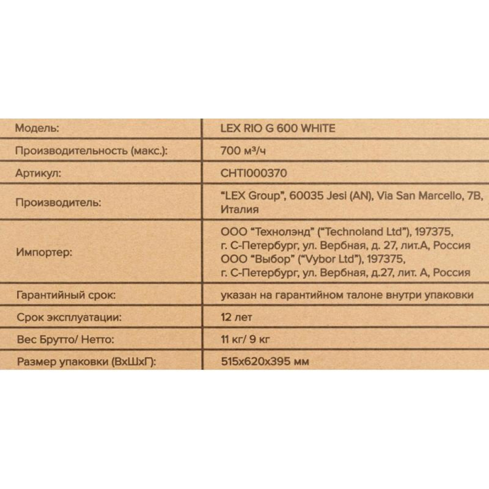 Вытяжка каминная Lex Rio G 600 белый управление: кнопочное (1 мотор)