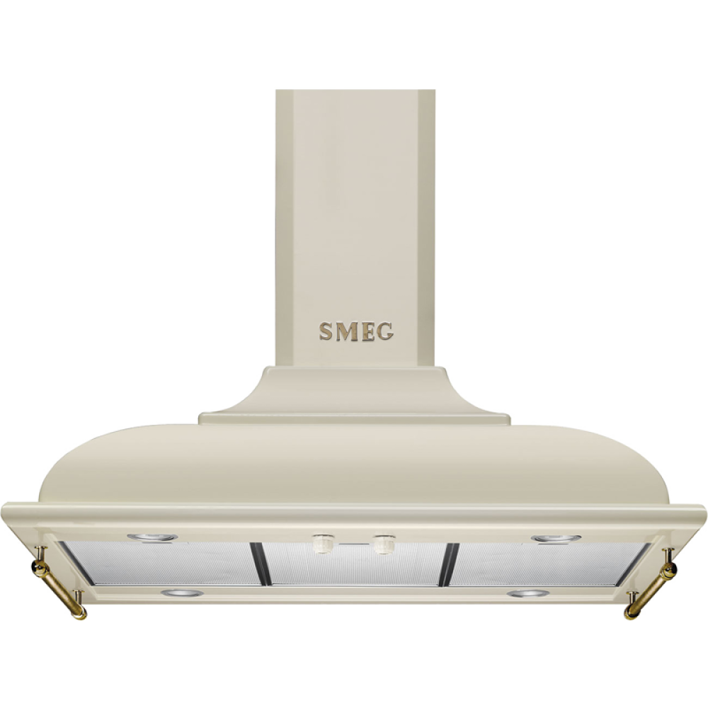 Вытяжка SMEG/ Cortina, вытяжка островная, 90 см, 754 м3, кремовый, фурнитура латунная (логотип+ релинги)